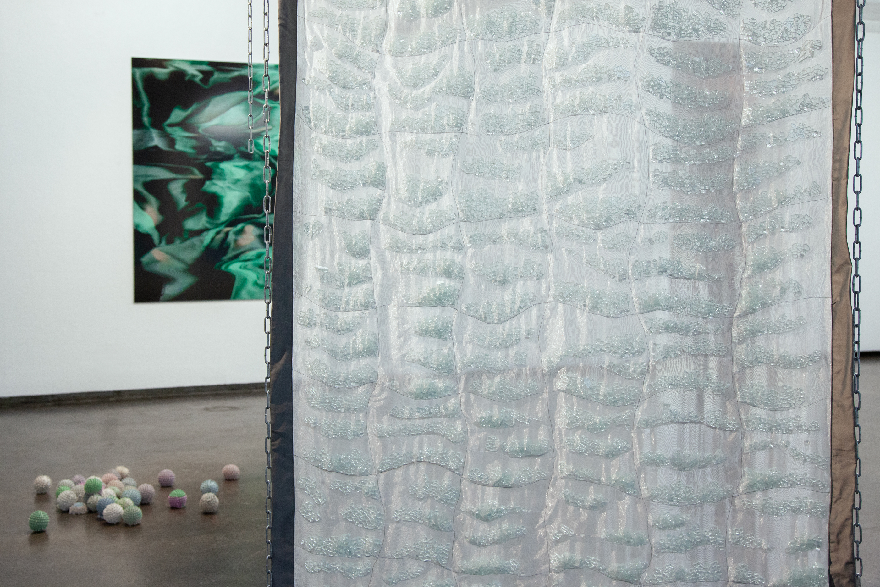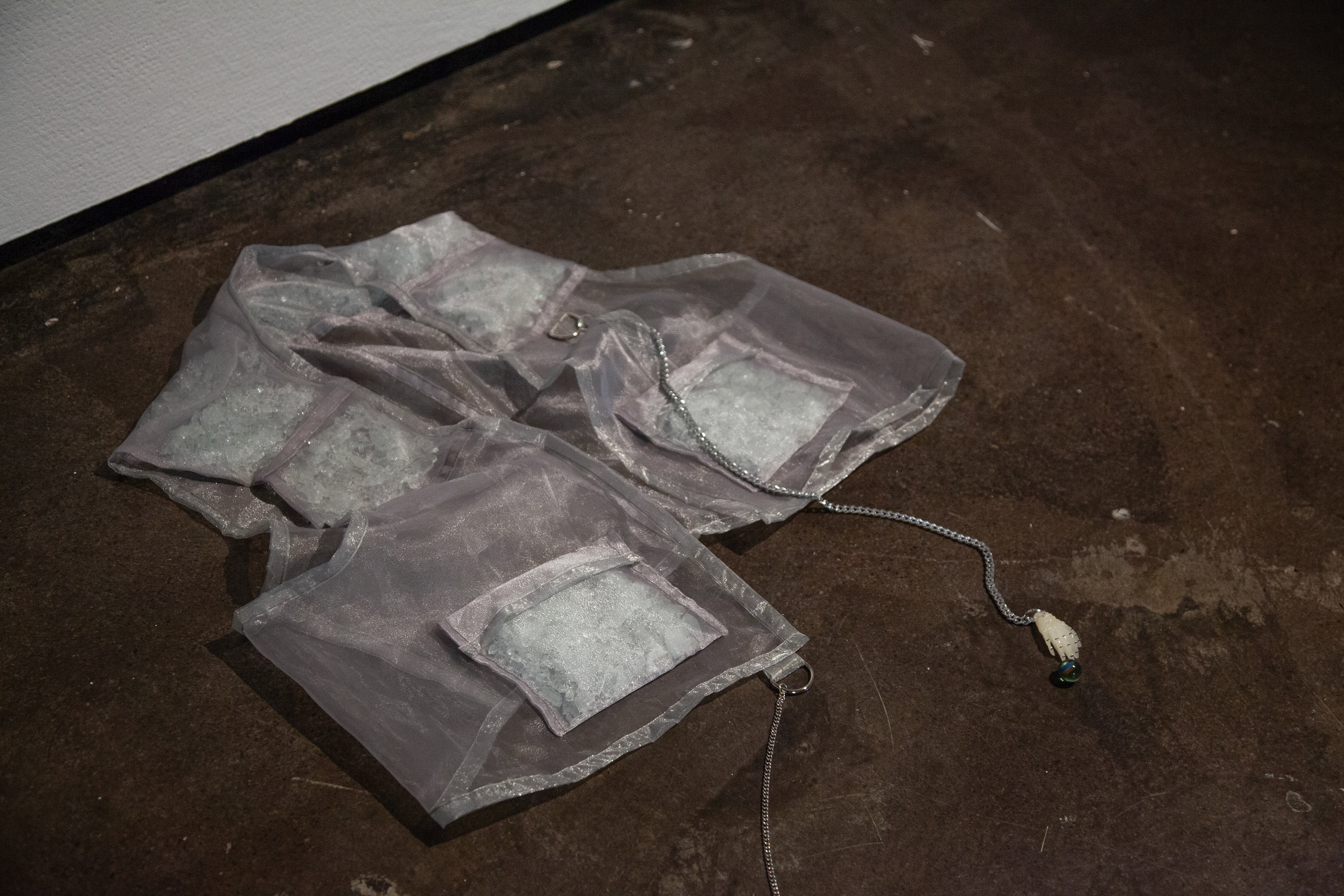 The photographs, made with a scanner to flatten focus and highlight details, reflect a neuroqueer gaze—one that resists fixed meaning. The sculptural works, like the title piece Gravity Blanket (2021)—a delicate but intimidating, glass-filled weighted blanket—address the complexities of neurodivergent coping.
